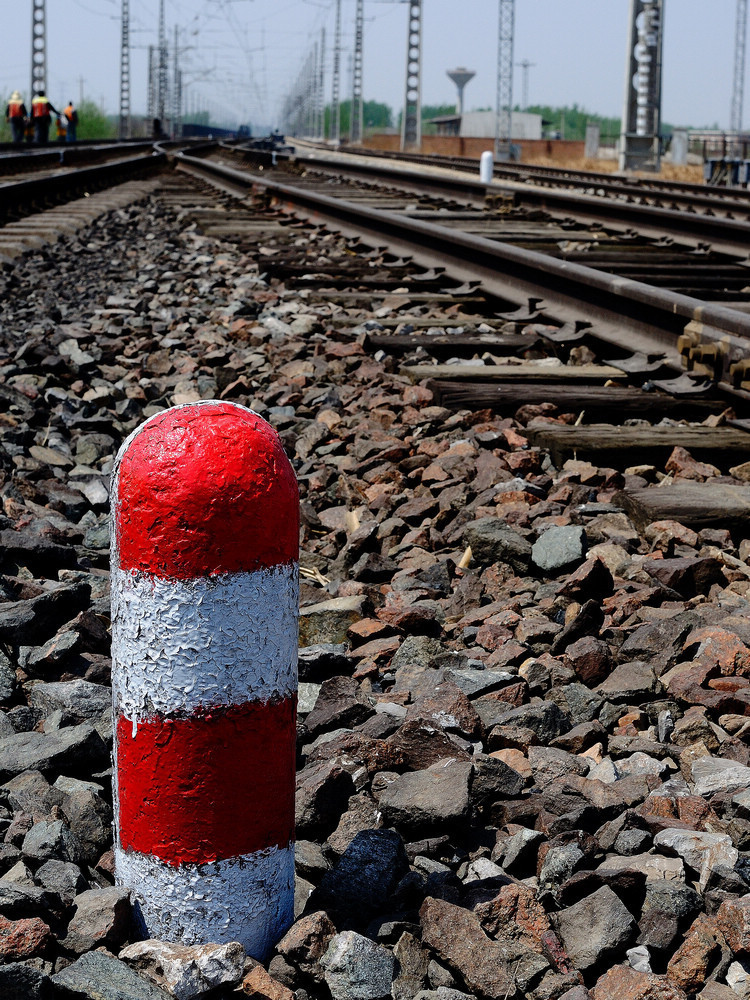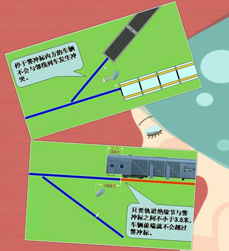为防止相邻线路上停留的机车车辆与本线运行的机车车辆发生侧面冲突,在两会合线路线间距为4米的中间设置警冲标,用来指示机车车辆的停留位置,防止机车车辆发生冲突。