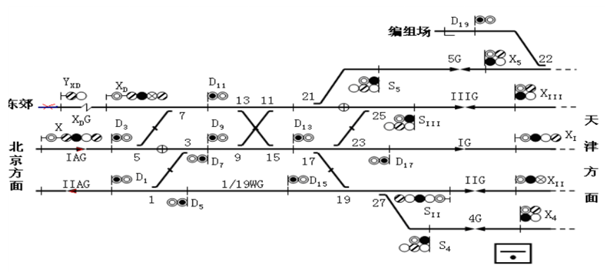 另外,在有正线通过列车的车站,为了简化排列进路的手续,还增设了通过按钮。例如举例站场下行进站信号机X的外方设置了下行通过按钮XTA;在上行进站信号机外方设置了上行通过按钮STA。