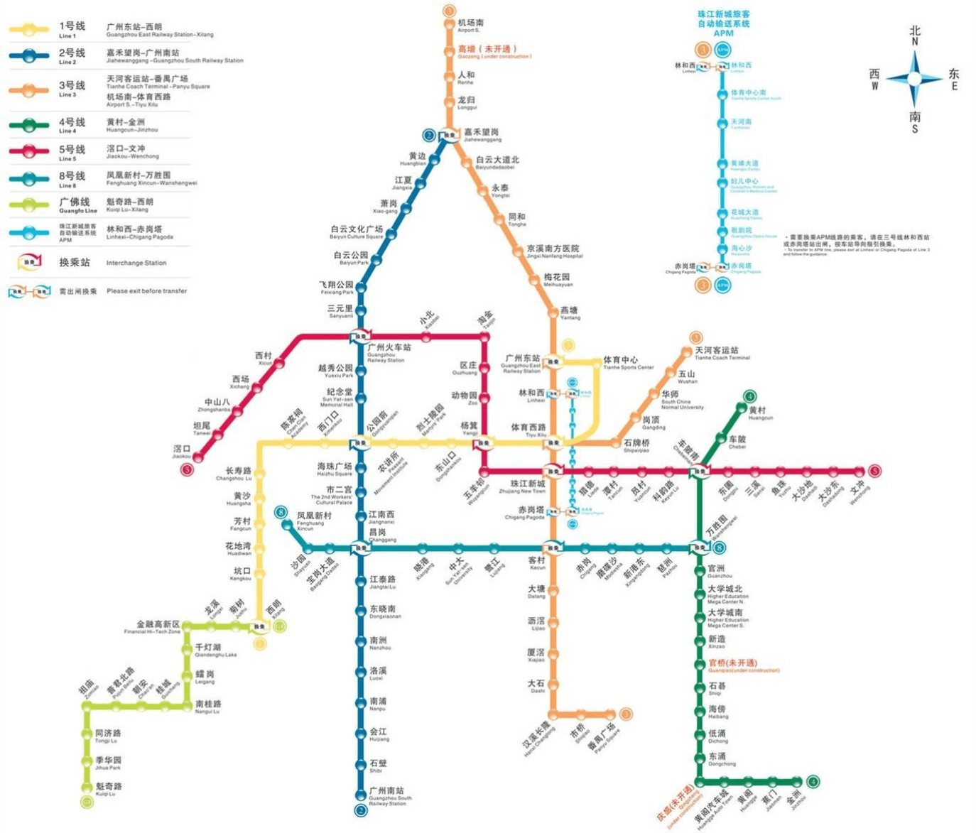 截至2019年12月28日,广州地铁运营线路共14条,分别为1号线、2号线、3号线(含三北线)、4号线、5号线、6号线、7号线、8号线、9号线、13号线、14号线(含知识城线)、21号线、APM线和广佛地铁,共设车站271座,共有换乘站31座,运营里程513公里;运营里程居中国第三,世界第三 。