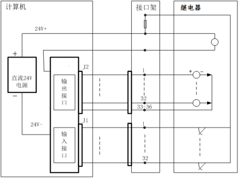 计算机联锁系统通过采集继电器接点的状态获得室外设备的状态信息。具体的采集电压为DC24V。+24V接在被采集接点组的中间接点。如图4-3所示,输入输出接口通过接口架与继电器组合相连接,进而采集继电器状态。接口架如图4-4所示,为连接输入输出接口与继电器的中间部分。在接口架上设36线插座。每个插座配32根信号线。继电器电路一侧的连线焊接在插座上,计算机一侧的连线用插头连接。