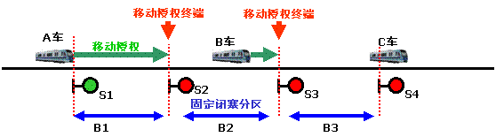 如下图示,B车已经出清S1-S2信号机间的闭塞分区B1,所以S1信号机可以显示通过信号允许A车占用B1分区,A车的移动授权终点为S2信号机前,S2信号机实现A车与B车的安全分隔。B车则因为C车的尾部尚未越过S4信号机,致使B3分区处于占用状态,限制了B车移动授权的延伸,虽然S3信号机至C车尾部之间还有较长的距离,但根据固定闭塞的分隔方式(一个闭塞分区只能一列列车占用)不能允许B车越过S3信号机向前运行,这个列子充分说明了固定闭塞的安全分隔方式制约线路使用效率充分发挥。