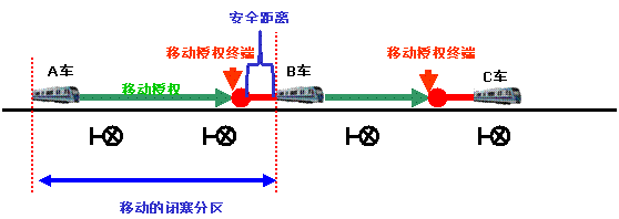 为保证列车的精确停车、准确的位置监督、准确的速度监督、移动授权变更信息能及时传递到列车,所以列车与轨旁设备间实现连续式通讯,列车被连续式ATP保护是实现移动闭塞方式运行的必要条件。如下图所示,采用移动闭塞分隔原理组织列车突破了固定闭塞分区的限制,大幅的提高线路的使用效率,有效的缩短行车间隔。