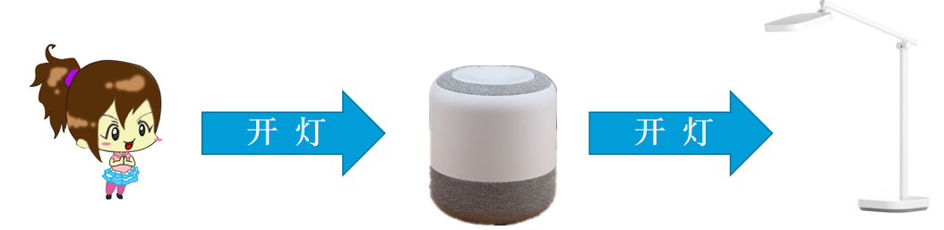 智能音箱是我们生活中常见的物联网设备之一。其中一个常用功能是通过语音让智能音箱开灯。请以一个简单的“通过语音控制智能音箱实现开灯”的场景为例,写出这个系统的基本结构。