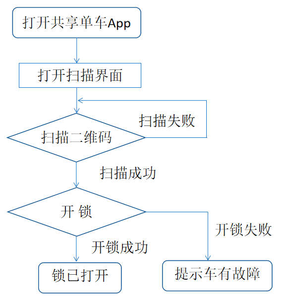 和信息系统一样,物联网系统中,也需要对系统需求进行各种设计,使用各种算法程序来实现相应的功能。以下是共享单车解锁的流程图。你能绘制出共享单车锁车时所实现的一系列功能的流程图吗?