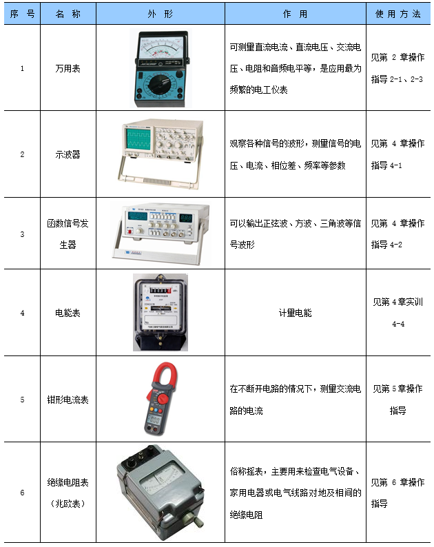 【常用仪器仪表】 常用仪器仪表主要有:万用表、钳形电流表、电压表、电流表、绝缘电阻表(又称兆欧表)、电能表、示波器等。