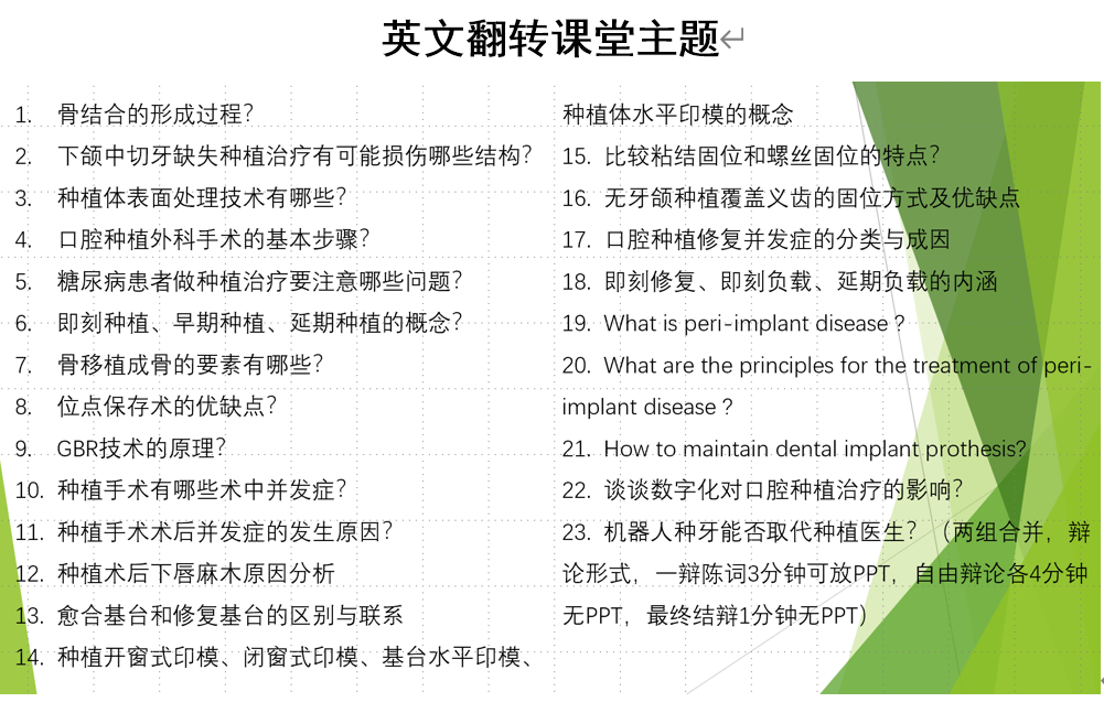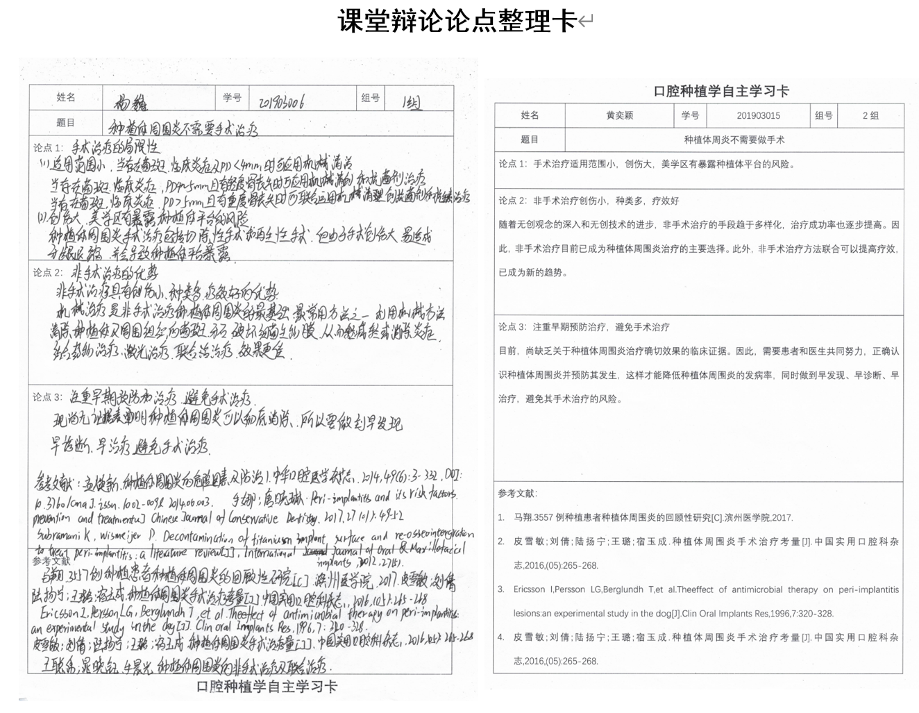 由于口腔种植学的特点是多学科交叉,更需要学生具备综合运用知识的能力。“口腔种植学”教学过程中,以课前的微课视频学习、文献阅读、辩论观点凝练、课堂文献汇报、课堂小辩论、课后多样检测等方法,引导学生自主学习。同时也引导学生围绕问题展开讨论,教师传授给学生的是解决问题的科学思维能力,以及现代循证医学所需的科学态度和思维方式。通过这种教学模式,学生对课程内容的吸收掌握情况较好,对课程有很高的认可度。