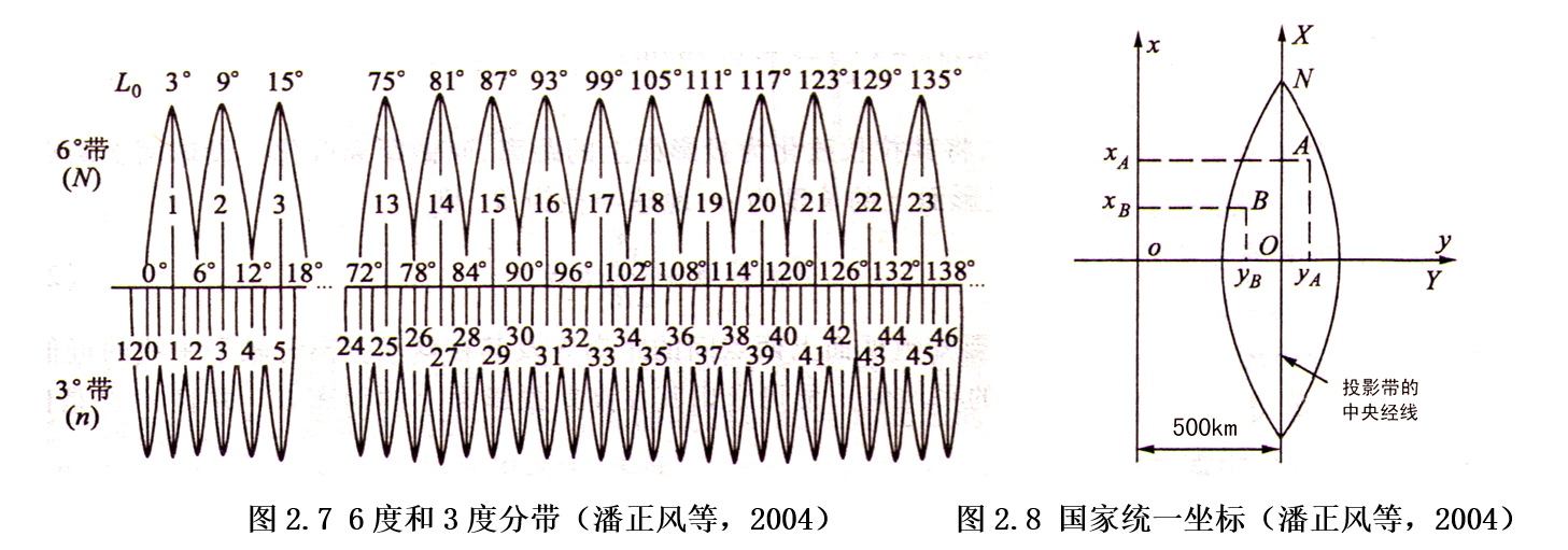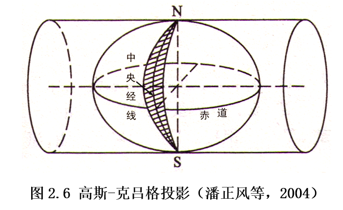 我国国家基本比例尺地形图中的大中比例尺地图,一律采用高斯-克吕格(Gauss-Kruger)投影——横轴等角切椭圆柱投影(图2.6)。其中1:1万比例尺的地形图采用经差3度分带,1:2.5万~1:50万的采用经差6度分带(图2.7)。在每一个投影带内布置平面直角坐标系统。