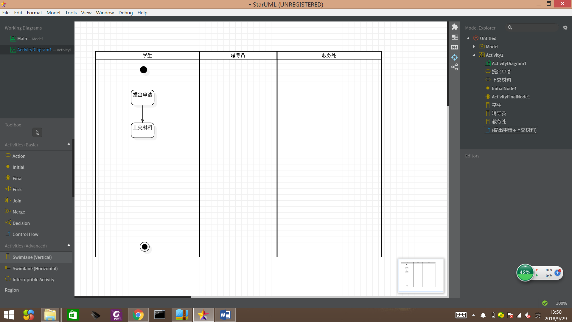在画布上安排好泳道(swimlane),然后绘制相应活动。