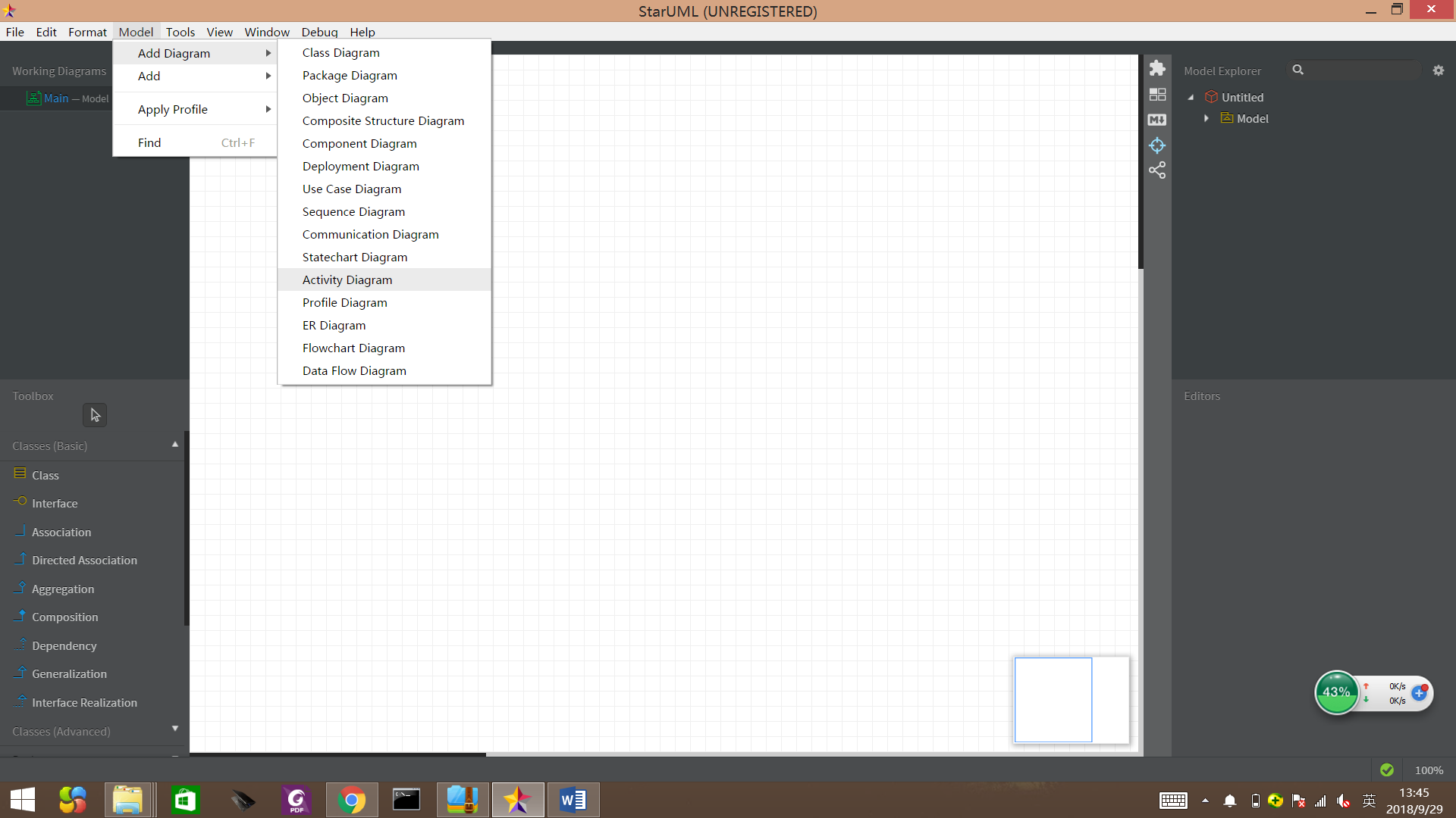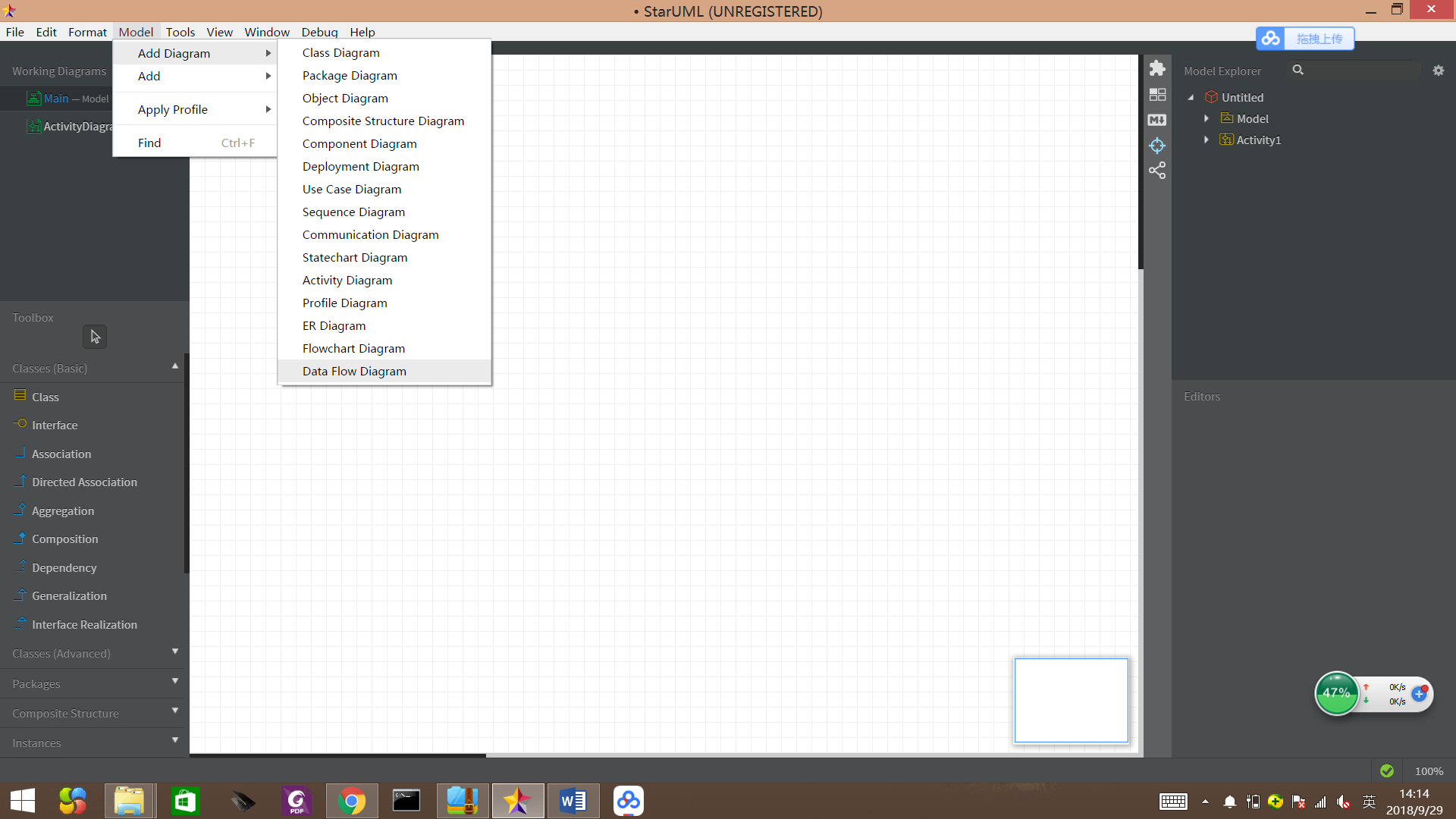 打开软件后,执行菜单“Add Diagram | Activity Diagram”,中间是画布,左侧上部是正在绘制的模型图,左侧下部是图形工具箱,右侧是模型资源管理器(显示一个模型图包含的所有元素)。