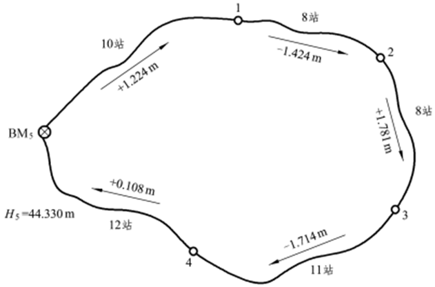 2.. 在某山区建筑工地布设一条闭合水准路线,如图所示。计算闭合水准路线各水准点的高程。(列表计算)