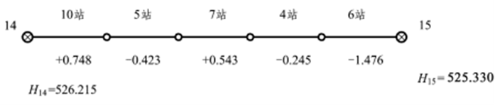 | 点号 | 距离 (km) | 高差 (m) | 改正数 | 改正后高差(m) | 高程 (m) | |