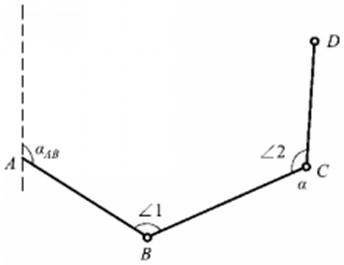 4、如图所示,已知AB边的坐标方位角为aAB=149°40’00”,又测得角1值为168°03’14”、角2值为145°20’38”,BC边长为236.02m,CD边长为189.11mm,且已知B点的坐标为xB=5806.00m、yB=9785.00m,求C、D两点的坐标。