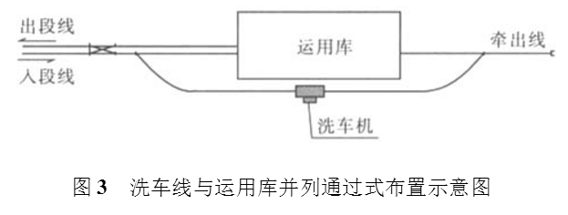 洗车线与运用库并列通过式布置同样要求车辆段有足够的用地长度。一般来说,可以采用这种布置型式的用地条件,也可以采用运用库尽头式布置,洗车线咽喉区通过式布置的型式。其选择要综合考虑车辆段总平面布置的各种因素确定。广州地铁2号线赤沙车辆段和4号线新造车辆段都采用这种布置型式。