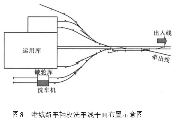 由于这种布置方案洗车效率低,一般只适用于小规模的车辆段(或停车场),或在用地条件确实无法实施其他方案时采用。国内上海地铁车辆段使用这种布置型式比较多,如宝钢车辆段,港城路车辆段等。图8为上海地铁六号线港城路车辆段的洗车线平面布置图。