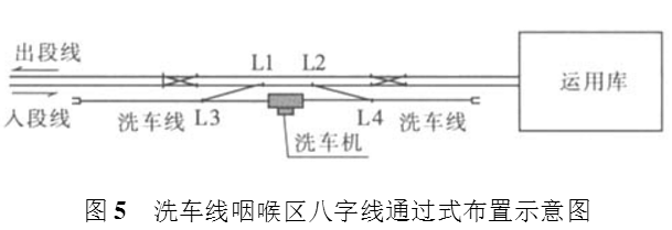 咽喉区八字线布置型式在国内首次运用于广州地铁3号线洛溪车辆段。图6是洛溪车辆段的洗车线平面布置图。