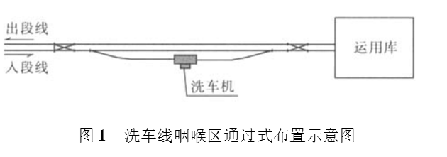 洗车线的布置型式一般有咽喉区通过式布置、与运用库并列通过式布置、咽喉区八字线通过式布置、尽头线往复式布置等几种典型的布置型式。其选择主要受用地条件、接轨站的配线方案和车辆段总平面布置方案制约,既灵活多样,又难以把握。