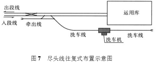 当车辆段用地长度受到限制不能满足方案一和方案二的布置型式时,也可以考虑采用本方案。洗车机的布置位置比较灵活,一般并列布置在运用库一侧。列车入段时需要清洗的列车首先进入洗车线完成洗车作业后,转换运行方向,反向通过洗车机进入牵出线,在牵出线上再次转换运行方向后进入运用库。列车2次通过洗车机,因此定义为往复式布置。从列车入段到洗车完毕进入运用库,也需要2次转换列车运行方向。