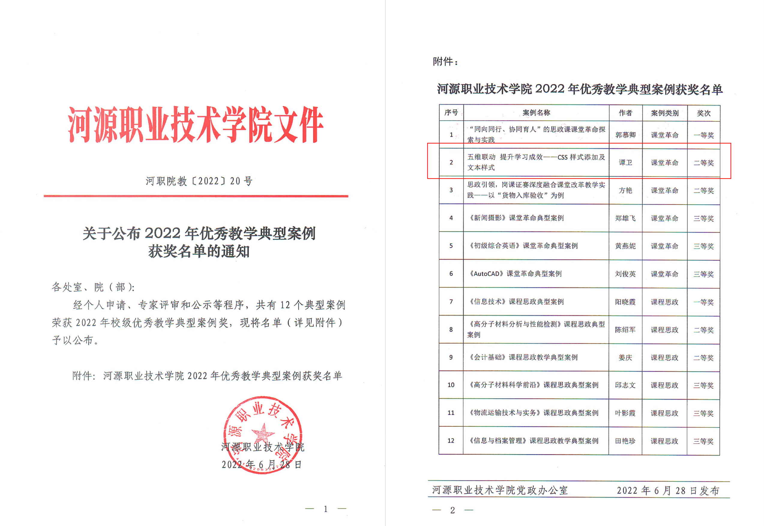 1.课例获评河源职业技术学院2021年课堂革命典型案例二等奖