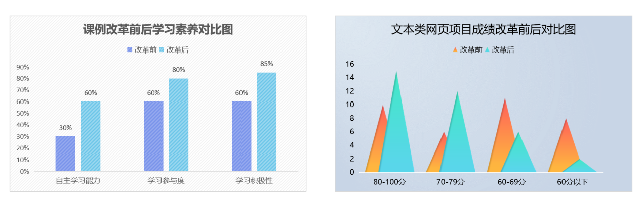 课例改革应用于课程CSS模块学习单元,相对于改革前的教学方式、学生自主学习能力、学习参与度、学习积极性及学习效果明显提升,课程建设质量、教学质量与满意度逐年提高。