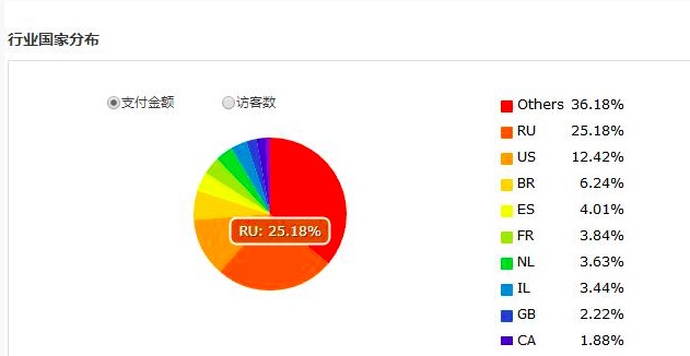 跨境电商虽然面对的是全球的客户,但是如果我们把店铺定位为全球的话,这个店铺定位就太大了。因为定位国家越具体,我们的店铺就越好做精准的运营。当你的产品在一个国家变成了小爆款,哪个国家购买力狠高,那么你的销量也就高了。那么我们如何才能找到目标国家呢?我们通过数据纵横中的“行业国家分布”,我们还是可以看到自己店铺经营的产品所处行业访客主要来自哪些国家。打开店铺的后台,找到我们主推产品的类目的行业情况,看看哪些国家是主运营国家,然后试着去做标题的优化,属性的优化,甚至详情页的优化。这样我们的转化率将会比之前增加很多!如下图: