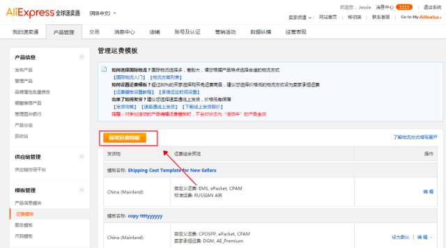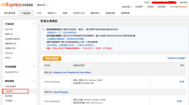 1、登录“速卖通卖家后台”,点击“产品管理”中的“模板管理”中的“运费模板”