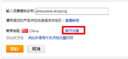 3、请输入运费模板英文名称,例如:Aliexpress shipping,并点击页面中的“展开设置”