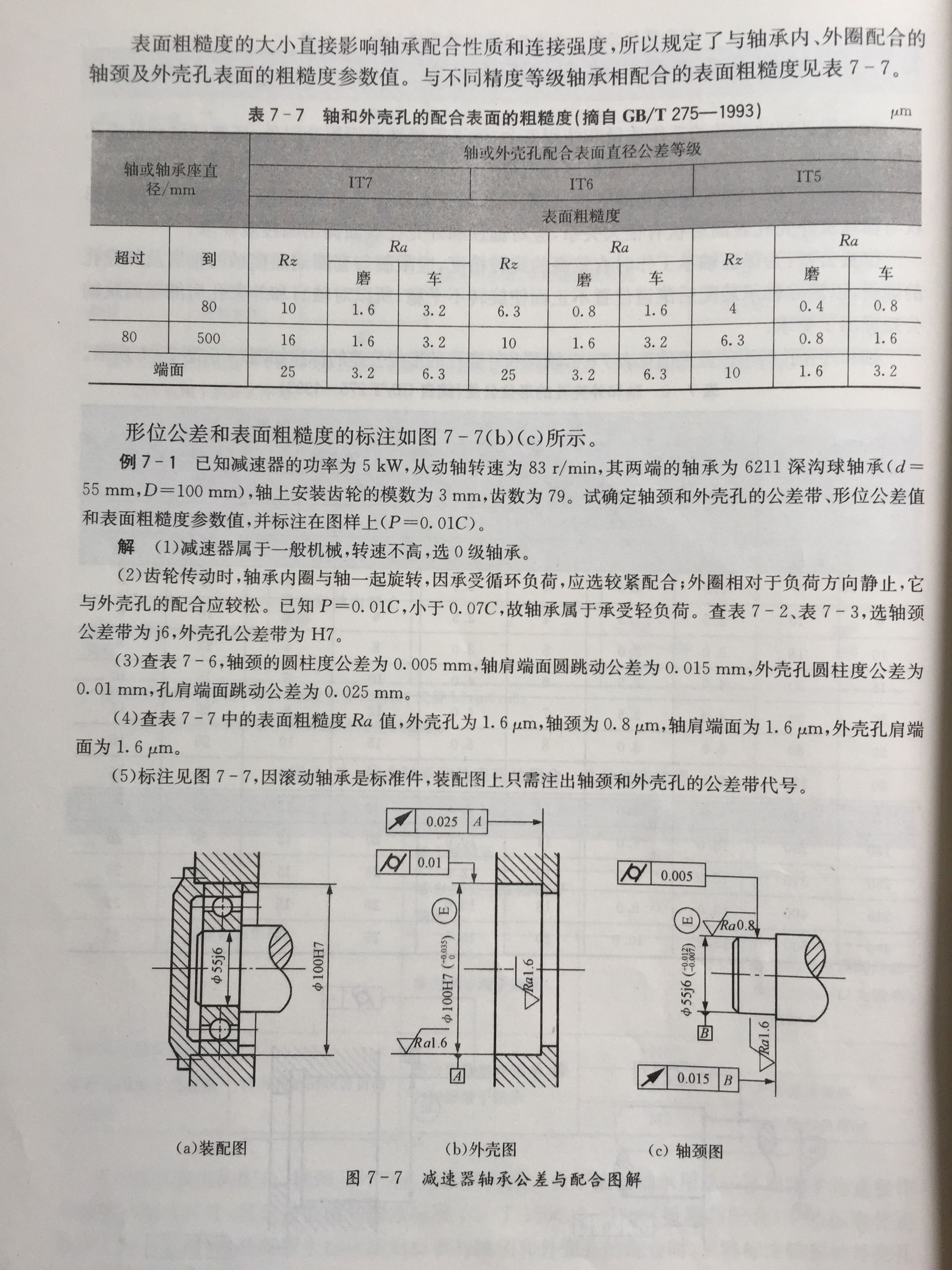 在装配图上标注滚动轴承与轴颈和外壳孔的配合时,只需标注轴颈和外壳孔的公差带代号。表面粗糙度的大小直接影响轴承配合性质和连接强度,所以规定了与轴承内、外圈配合的轴颈及外壳孔表面的粗糙度参数值。