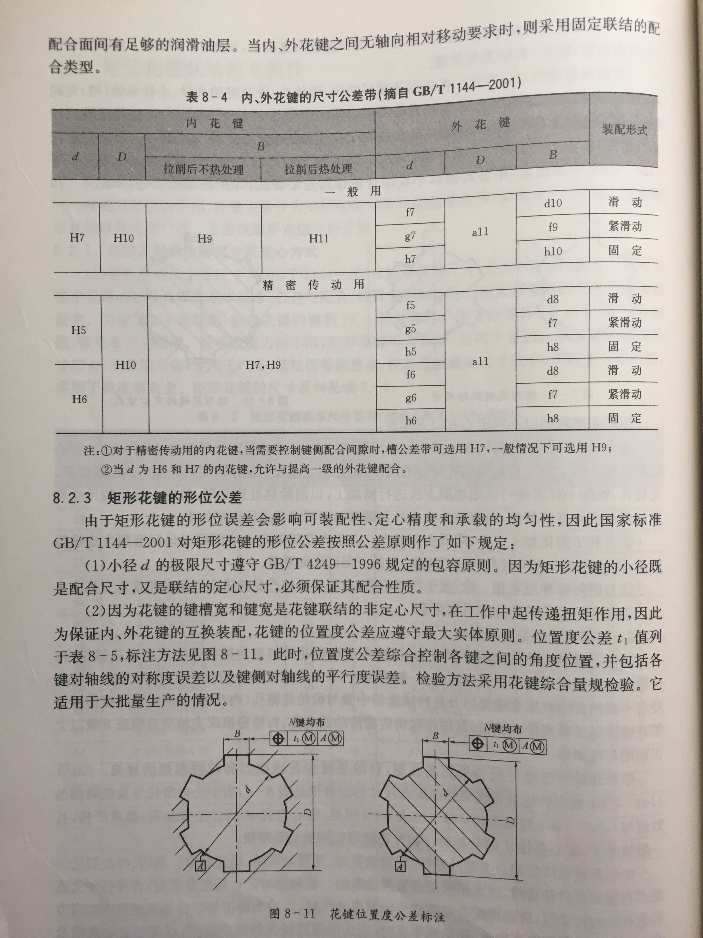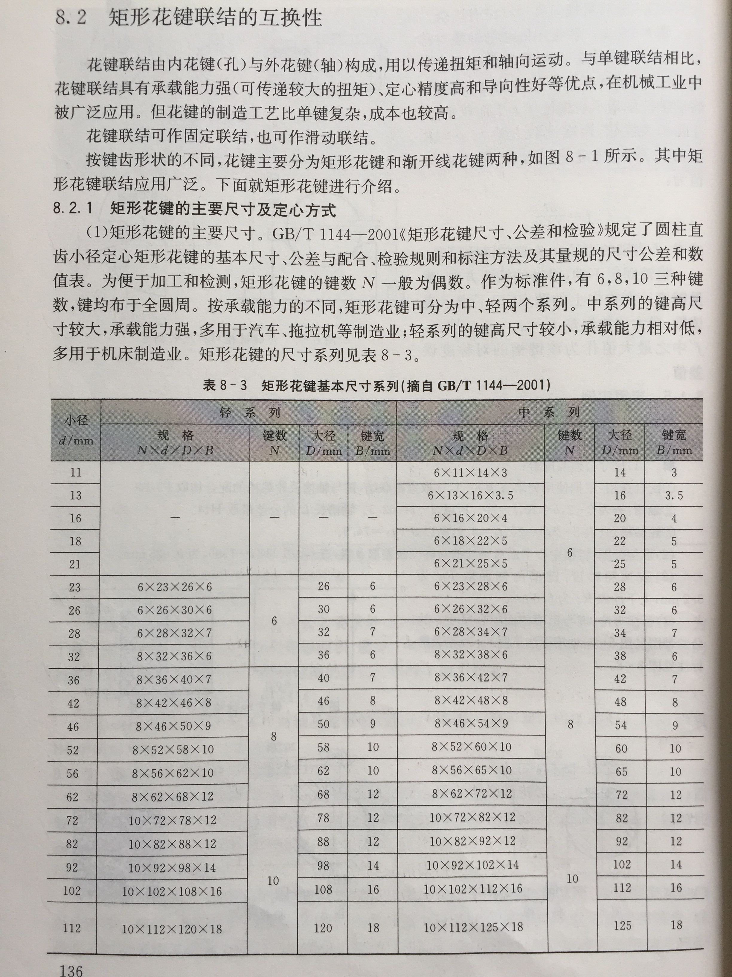 GB/T 1144-2001《矩形花键尺寸、公差和检验》规定了矩形花键的剖面形式、定心形式、尺寸要素、公差等内容。矩形花键的主要尺寸 :小径d、大径D、键槽宽B。 键数规定为偶数,分别为6、8、10三种。按承载能力的不同,矩形花键可分为中、轻两个系列。
