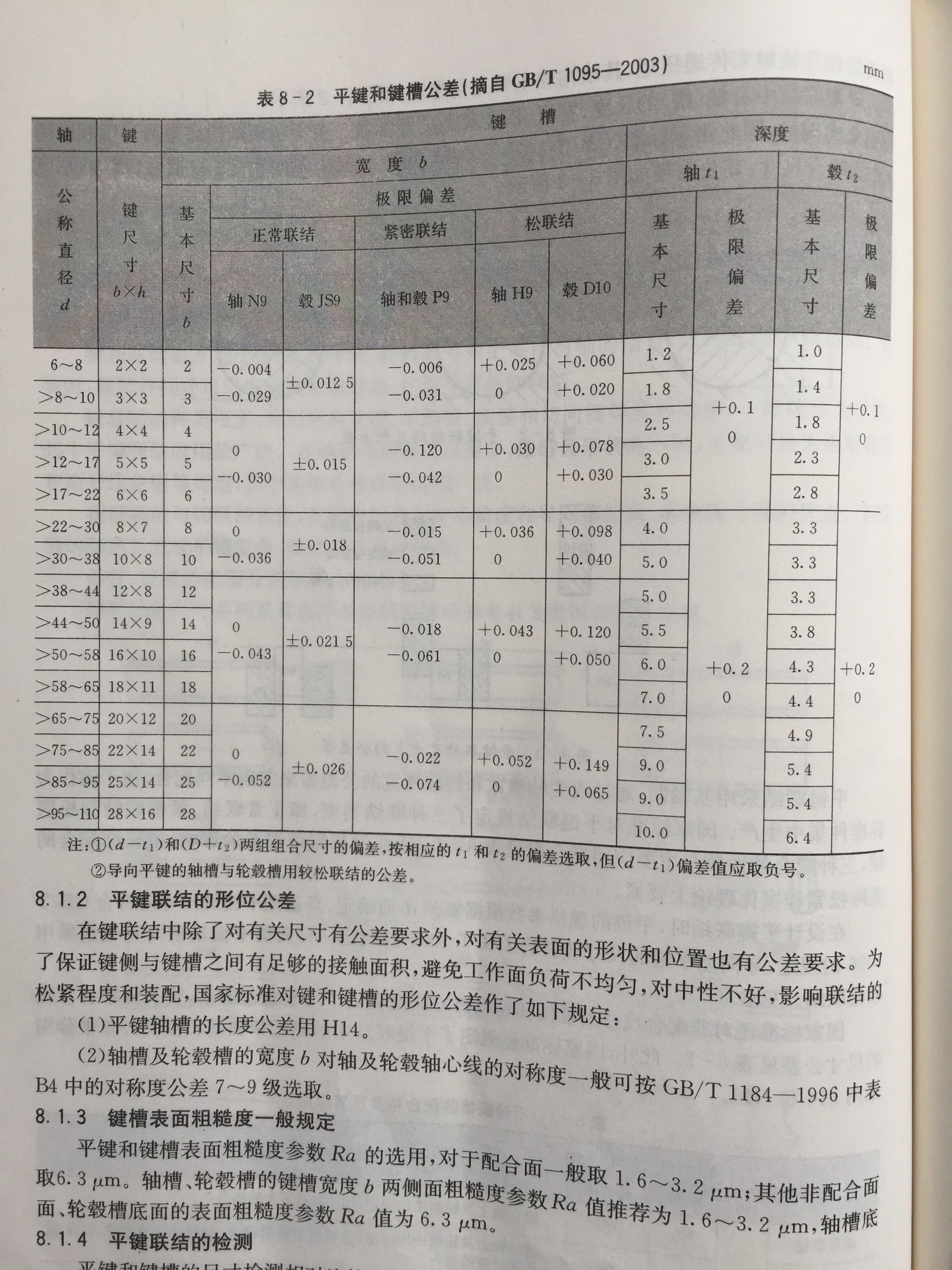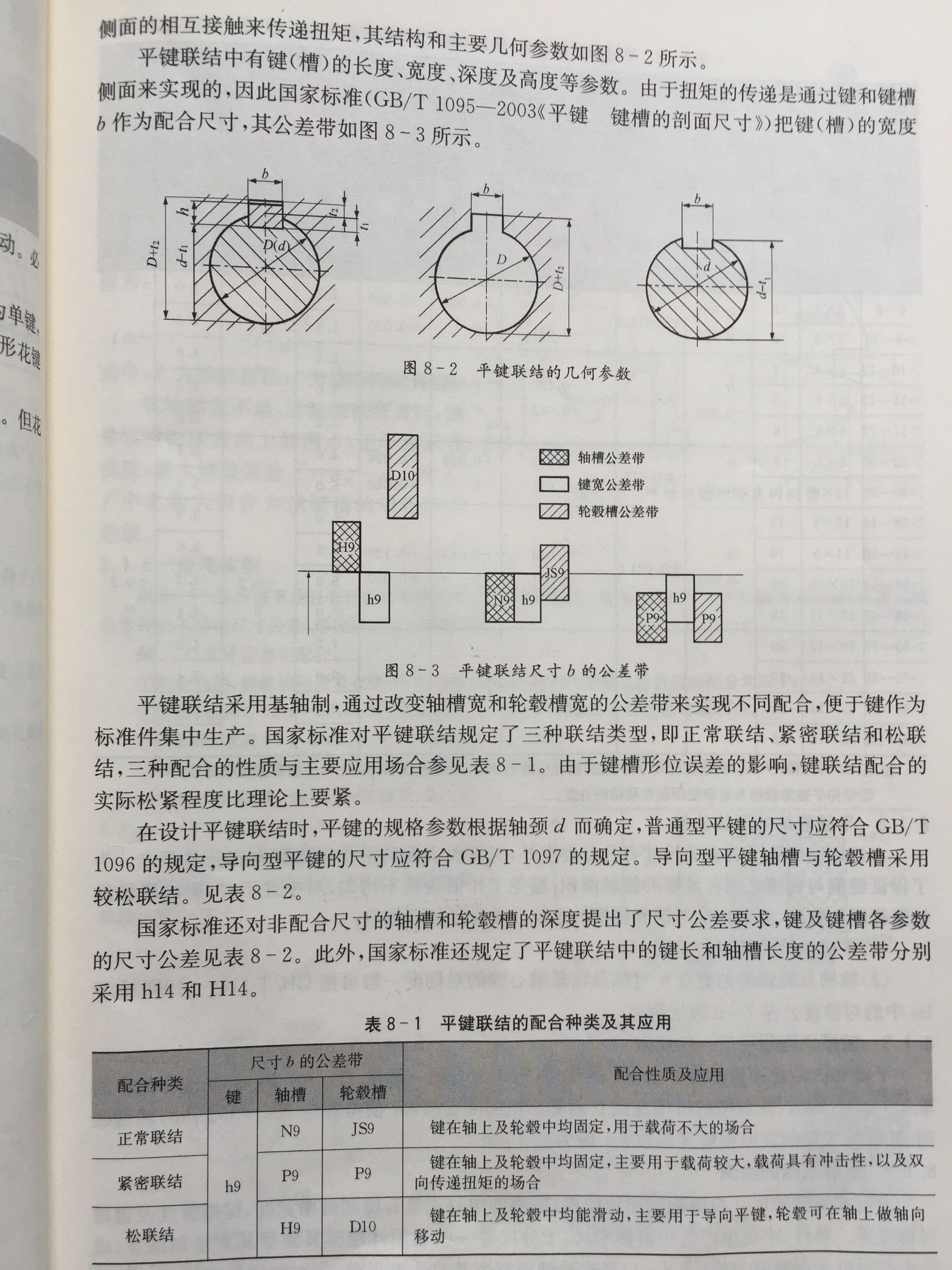 国家标准对平键联结规定了三种联结类型,即正常联结、紧密联结和松联结,三种配合的性质与主要应用场合参见表8-1。由于键槽形位误差的影响,键联结配合的实际松紧程度比理论上要紧。