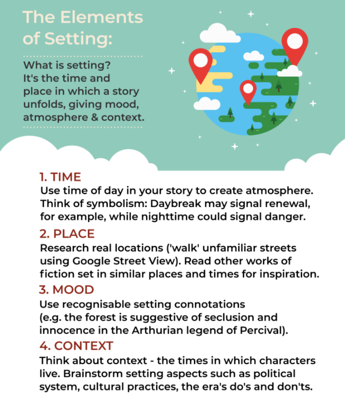 The elements of setting – time, place, mood, social and cultural context – help to make a novel feel real and alive. Read more about using the ingredients of setting to make your story more vivid: