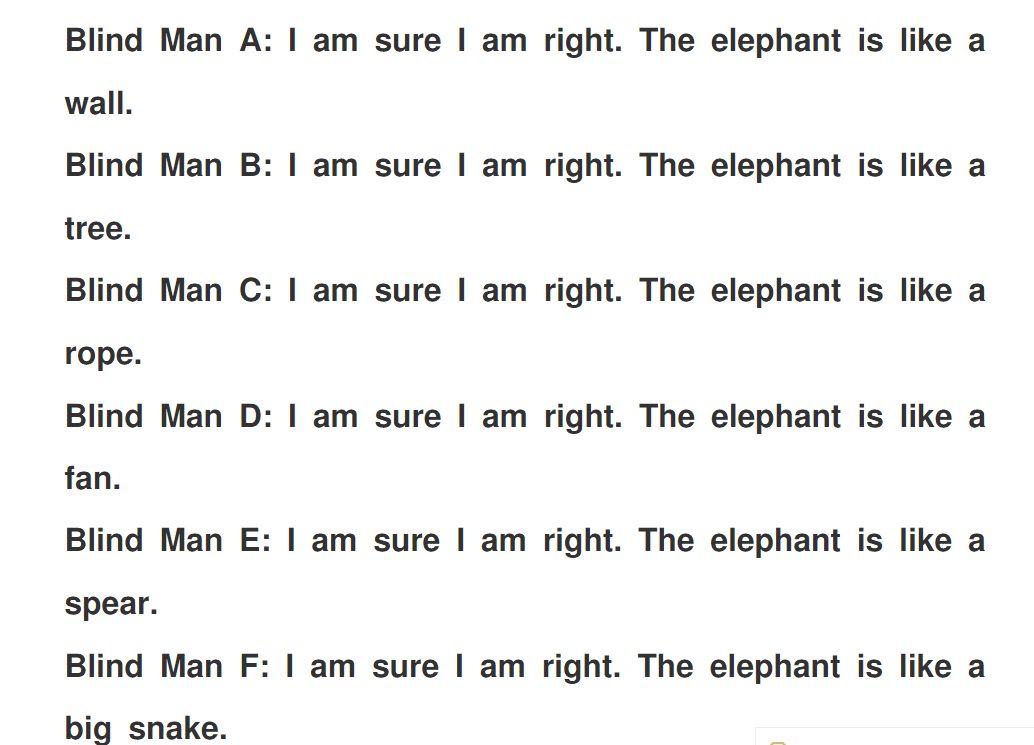Moral: It is not just blind men who make such silly mistakes. People whohave eyes sometimes act just as foolishly—when they take a one –sided view ofthings.