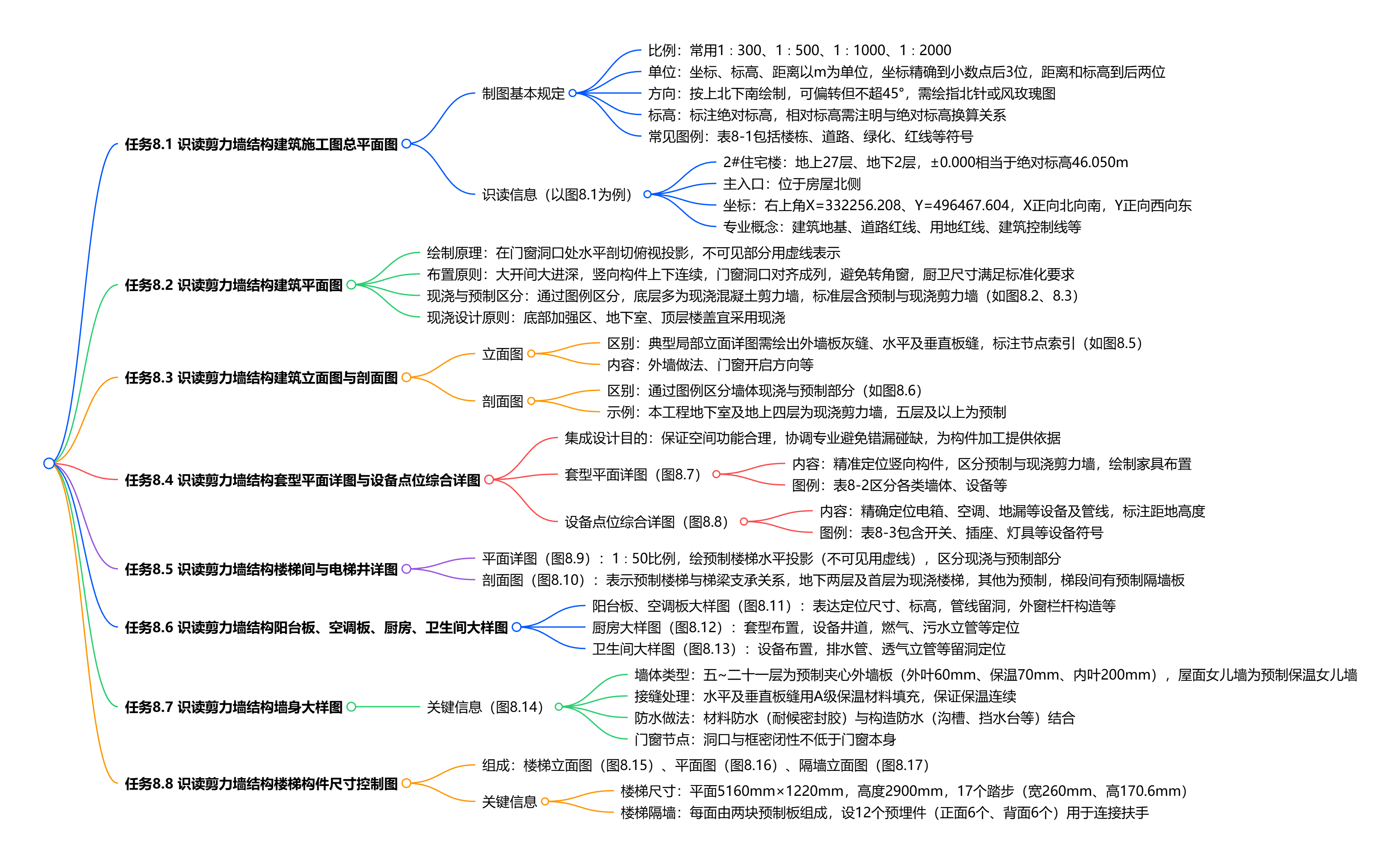 对典型装配整体式剪力墙结构住宅建筑施工图的识读方法进行讲解,介绍总平面图,各楼层平面图,立面图与剖面图,套型平面详图与套型设备点位综合详图,楼梯间、电梯井详图,阳台板、空调板、厨房、卫生间大样图,墙身大样图,楼梯构件尺寸控制图的表达方法。