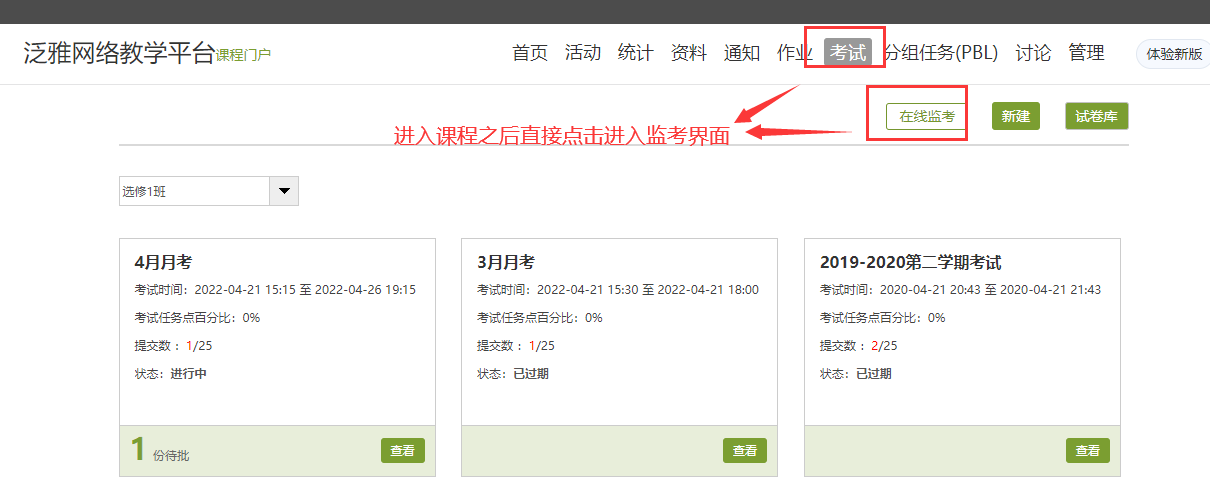 监考详情电脑上进入课程之后,点击左侧的考试栏目,点击最上面的监考。