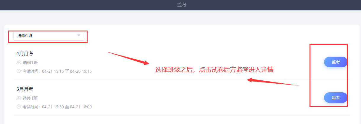 然后选择监考的班级,在班级下如果有对应的试卷,点击监考可以查看。在监考界面中可以查看参与考试的全部学生,包括学生的基本信息、考试状态、考试地点、考试方式、人脸识别情况、切屏情况等。