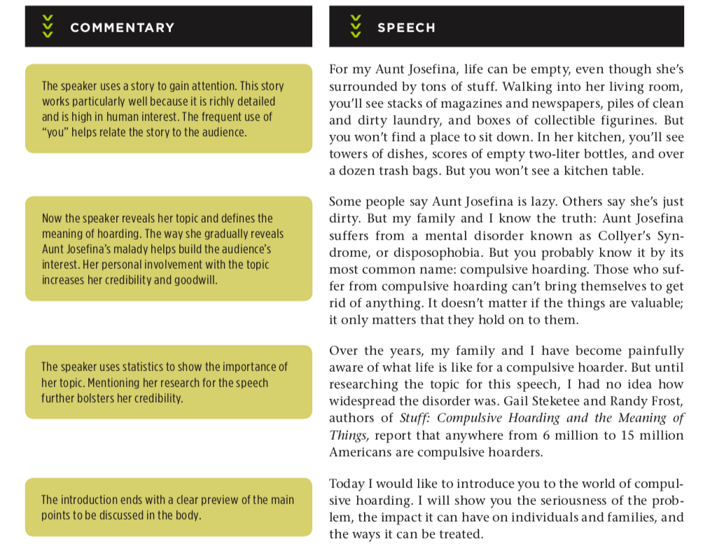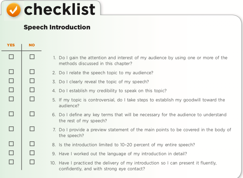 As in any social situation, your audience makes strong assumptions about you during the first eight or ten seconds of your speech. For this reason, you need to start solidly and launch the topic clearly. Focus your efforts on completing these tasks and moving on to the real information (the body) of the speech. Typically, there are six main components of an effective introduction. These tasks do not have to be handled in this order, but this layout often yields the best results.