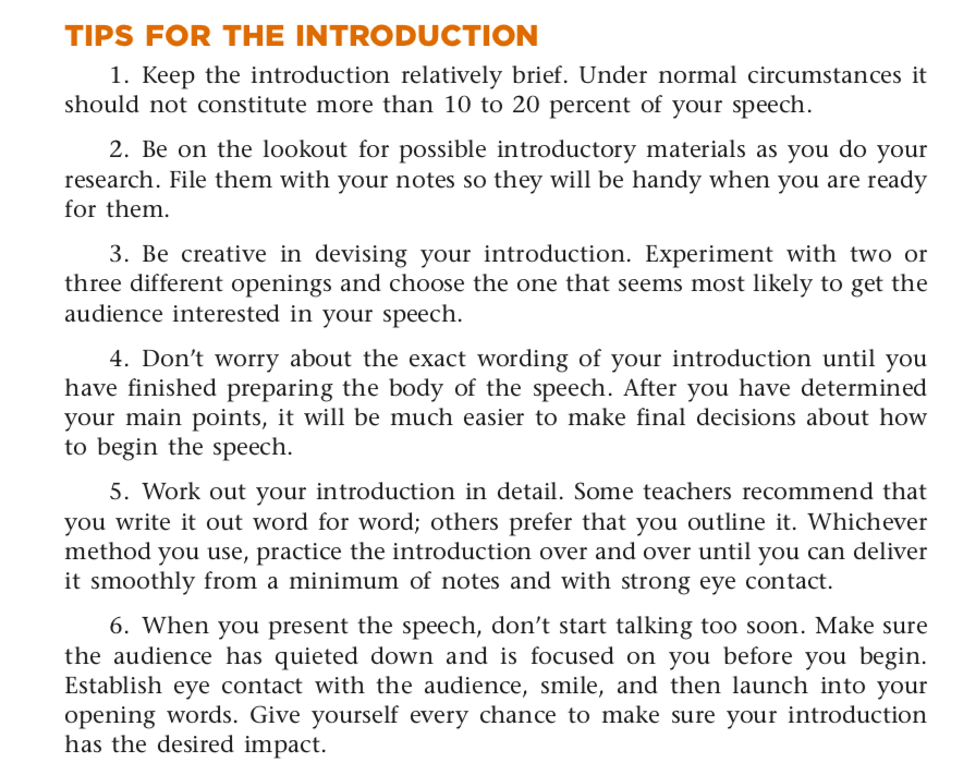 The introduction sets the tone of the entire speech. The introduction should be brief and to-the-point as it accomplishes these several important tasks. Typically, there are six main components of an effective introduction: