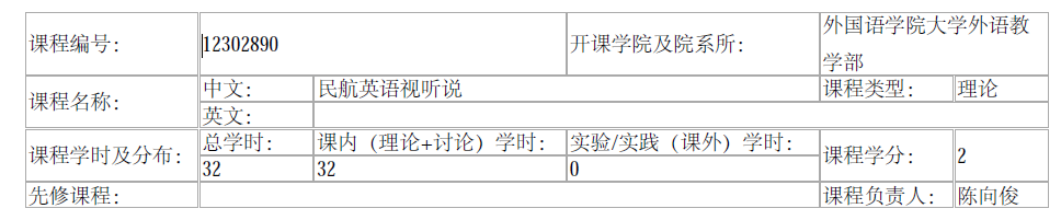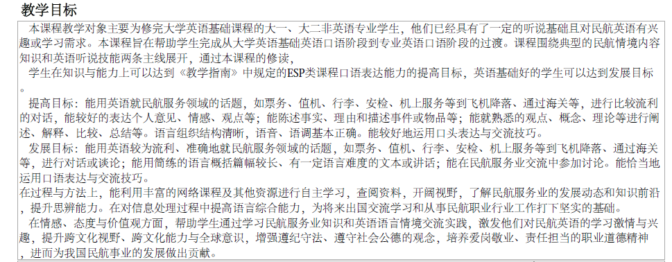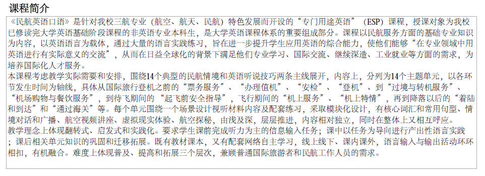 | 授课教材 | 《民航英语口语》刘长江主编 上海交通大学出版社 |