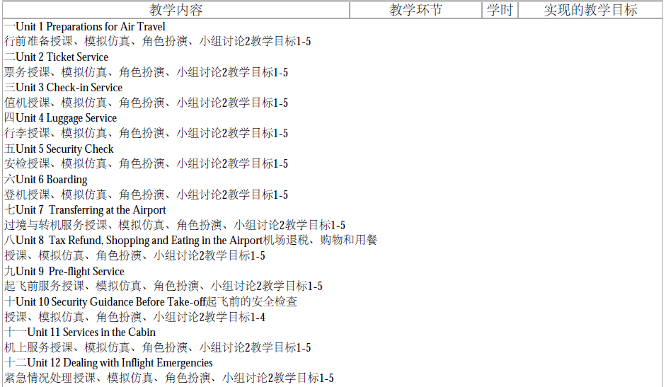 | 11 | 5.8-5.12 | 第13周 | 2 | Unit 11 Services in the Cabin (客舱内服务) |