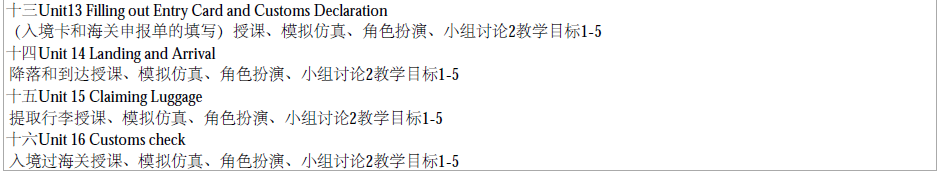 | 13 | 5.22-5.26 | 第15周 | 2 | Unit 13 Filling out Entry Card and Customs Declaration & Unit 16 Customs check (入境卡和海关申报单的填写&海关检查) |