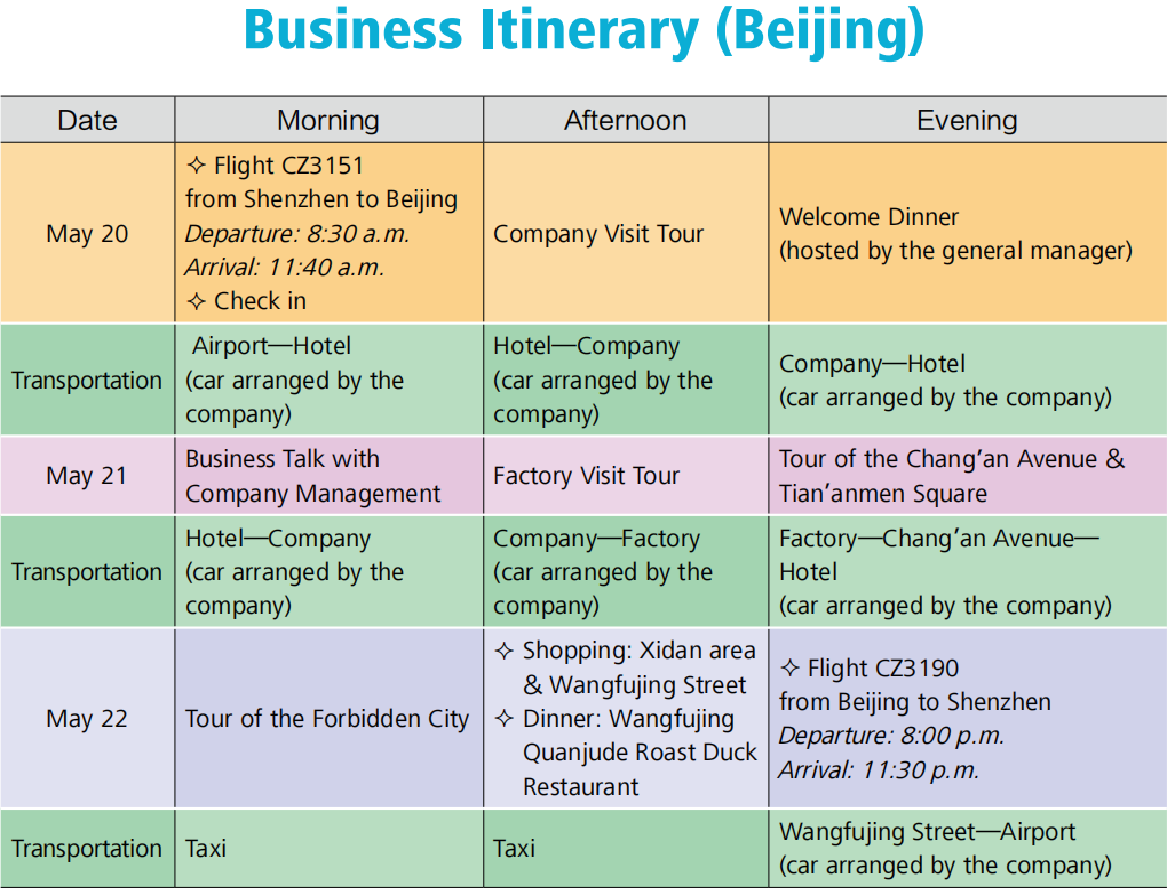 Make an itinerary (旅行计划) of a three-day business trip in your city for a group of foreign clients visiting your company.