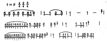 “起”由前三段构成,第一段为引子,音乐空旷而舒缓,把昕者引入深山峡谷的清幽之中。第一段实际上就是乐曲的引子。一开始就以八度的连续跳进刚劲的音调进行,展现出磅礴的气势。