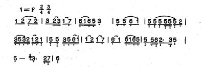 第二、三段则是同一旋律的变化重复,用了古琴特有的泛音奏法,使音乐显得格外清新、活泼,宛如空谷滴泉,响彻青山。第二段是乐曲的第一主题。曲调活泼生动,用泛音演奏,有如清澈山泉撞击碎石,源源不绝奔流丽出: