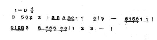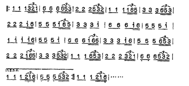 第二部分,音乐速度加快,其旋律是从第一部分八度跳进的音乐中发展而来。从全曲看,“徵”是旋律的中心音,而在此段中用了清角音“4”使旋律短暂离调,转人下属调性,造成对比和变化,形象地表现了渔夫荡桨归舟、乘风破浪前进的欢乐情绪: