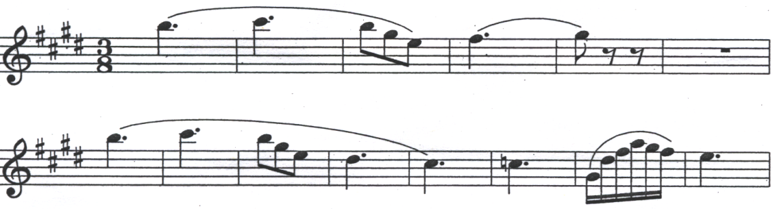之后的乐队伴奏音型,预示了主部主题出现时继续保持的状态,而主部主题就在这个背景上开始呈示。主部主题由双簧管和单簧管奏出,音乐舒缓而苍凉,充满痛苦,仿佛是主人公在诉说一种长期淤积在胸的郁闷,又像是发自内心的一首悲歌