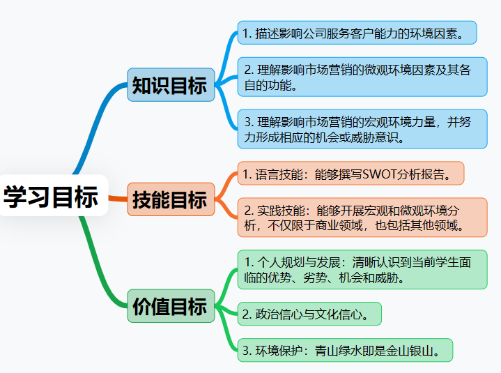 Knowledge objectives | 1) Describe the environmental factors that affect the company’s ability to serve its customers. 2) Understand the micro environmental factors that influence marketing and their respective functions. 3) Understand the macro environmental forces influencing marketing and try to form an awareness of corresponding opportunities or threats. |