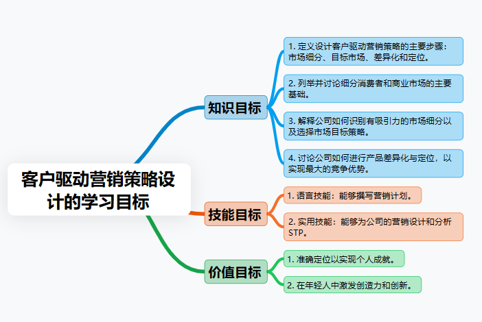 Knowledge objectives | 1) Define the major steps in designing a customer-driven marketing strategy: market segmentation, targeting, differentiation, and positioning. 2) List and discuss the major bases for segmenting consumer and business markets. 3) Explain how companies identify attractive market segments and choose a market-targeting strategy. 4) Discuss how companies differentiate and position their products for maximum competitive advantage. |
