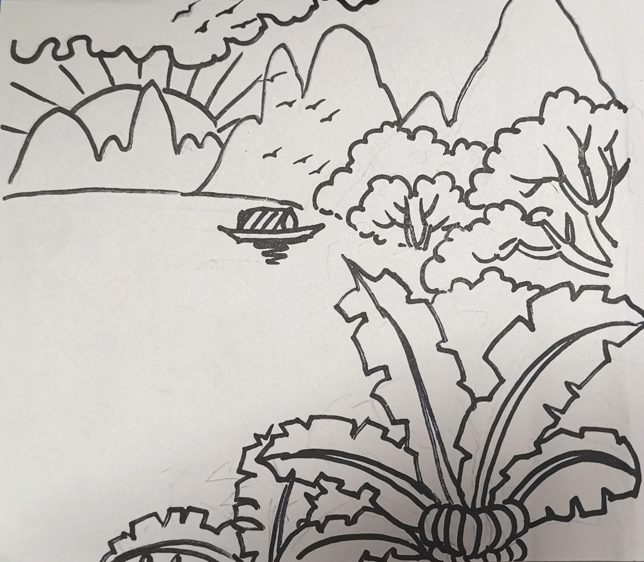 (5)安排好画面的景物,注意景物简笔画的透视原理。物象应近大远小;物象应近高远低;物象应近稀远密;物象应近实远虚。