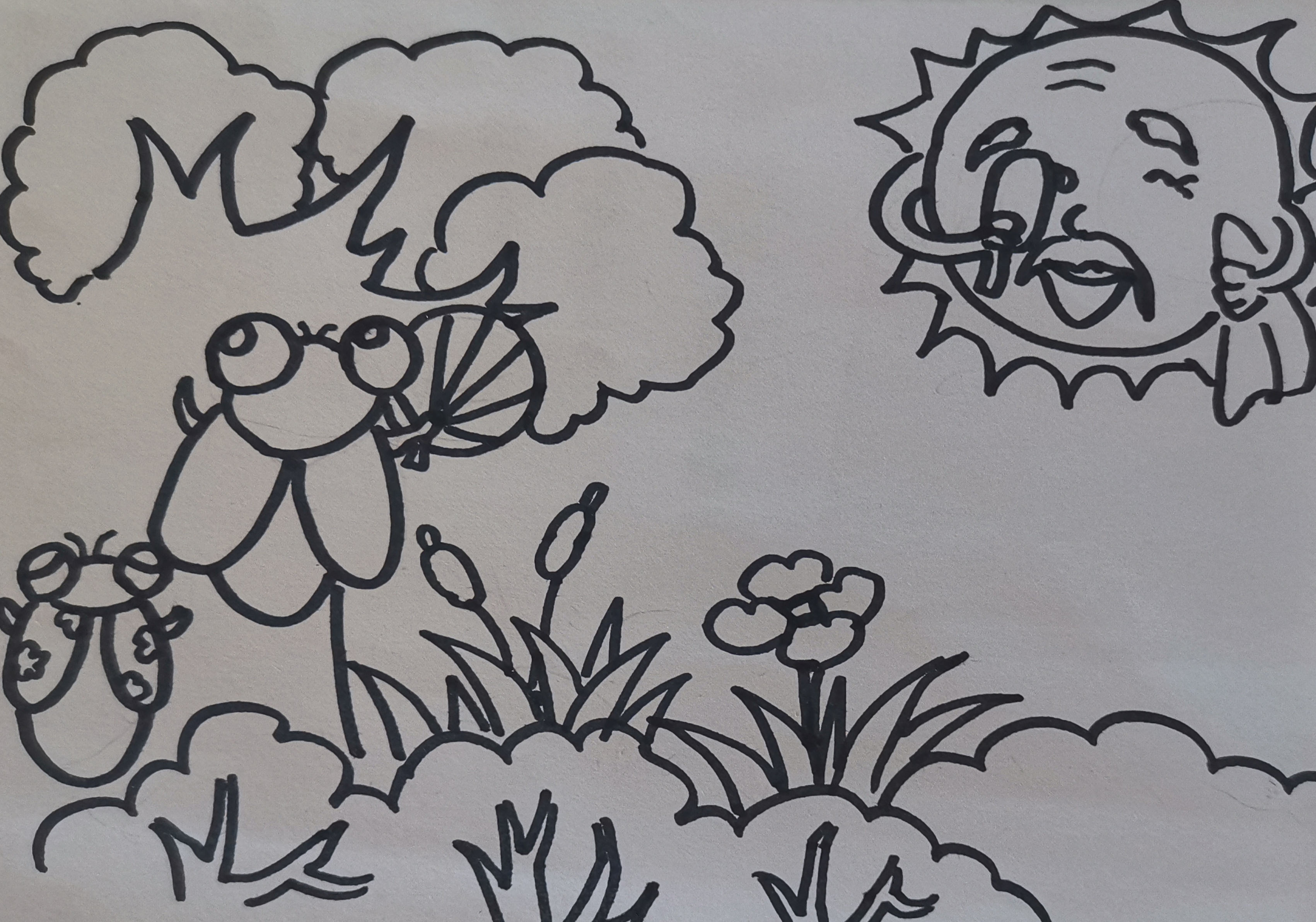步骤三:改编形象。将选择的形象用简笔画画出来,用拟人法画出小猪的形象,将小猪模仿人扇扇子和睡觉的姿势。