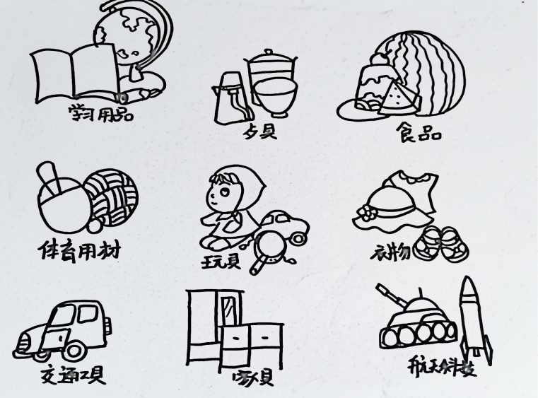 静物类简笔画表现非常广泛,涵盖了生活的衣食住行各个方面。常见的静物有衣服、家用器皿、餐具、家具、食品、家具、工具、交通工具等。与幼儿相关密切的静物有餐具、玩具、衣服、食品、体育器材等。为了方便学习静物类简笔画,要学会将静物类简笔画进行归纳,将具有相同形状的一类归纳在一块来学习和识记。如衣服的基本形只可以概括成梯形,家电类多是方形,而家具的构造有着共同的规律。总之学习画静物简笔画要学会归纳,将具有相同形状的或相同结构的静物分类学习。下面将常见静物分为四大类,分别是: