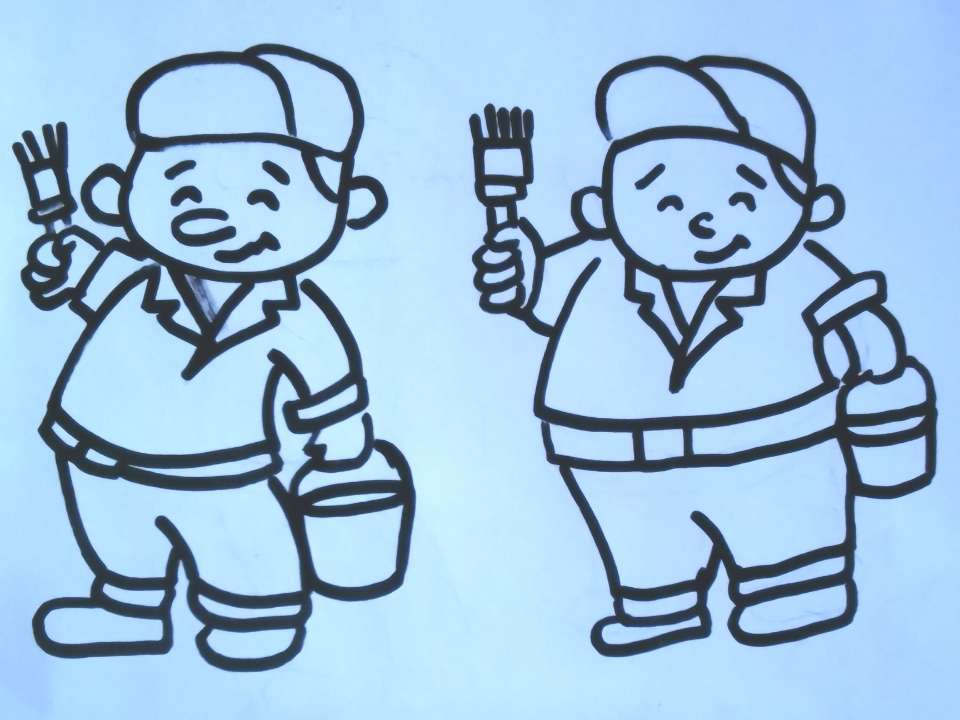 步骤三:用形体画法再线面的基础上进行添画,进一步表现出人物的神态、着装及职业、民族等特征。服装搭配要符合年龄特征,如幼儿穿着为短袖、短裤,老年人穿着老式中山装等。